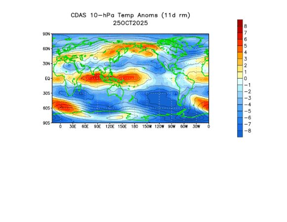 An unusual early season stratospheric warming event has taken place in the Northern Hemisphere causing a disruption (stretching) of the polar vortex and there may be additional bursts of warming (shown in orange) during the next several weeks. The disruption of the polar vortex can set off a chain events that ultimately help to unleash Arctic air masses from northern Canada into the US and, if history is any guide, that can result in some intense cold. This 30-day loop of 10 millibar temperatures (stratosphere) features a burst of warming (shown in orange) during the past several days in the polar region of the Northern Hemisphere. Maps courtesy NOAA