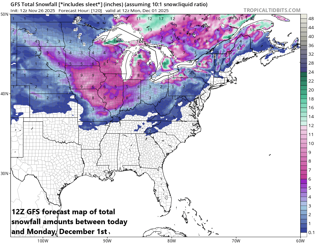 This forecast map of total snowfall amounts between now and Monday, December 1st, includes snow that falls during the Thursday/Friday Great Lakes snow event, and the weekend snowstorm in the Upper Midwest. Map courtesy NOAA