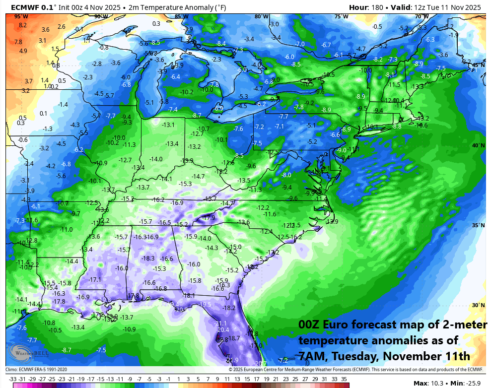 Arctic air will invade the eastern US early next week likely resulting in temperatures some ten to twenty degrees below-normal all the way from southern Florida-to-Maine. Map courtesy ECMWF, Weather Bell Analytics