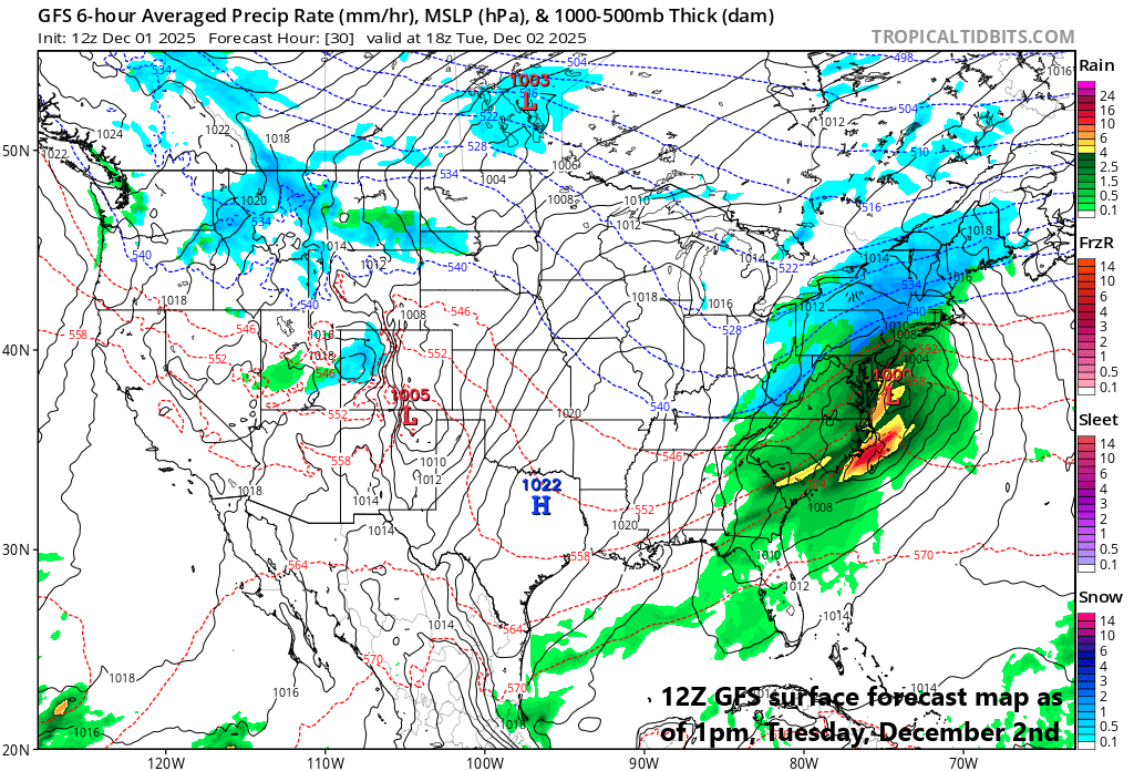 Low pressure heads to a position off the Mid-Atlantic coastline by later tomorrow as high pressure retreats off the Northeast US coastline. Map courtesy NOAA, tropicaltidbits.com