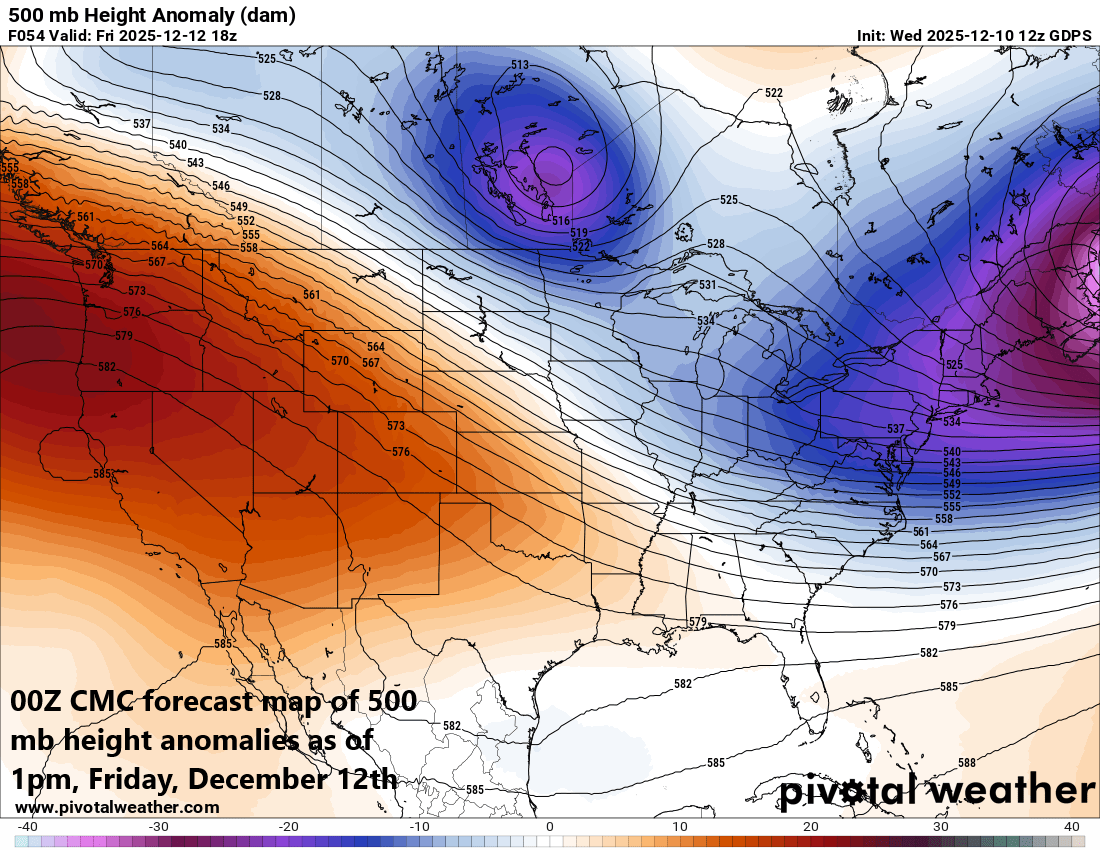 The upper-level support will be “strong” for the “clipper” system that reaches the Mid-Atlantic region later in the weekend and it can produce some accumulating snow across the DC-to-Philly-to-NYC corridor. Map courtesy Canadian Met Centre, Pivotal Weather