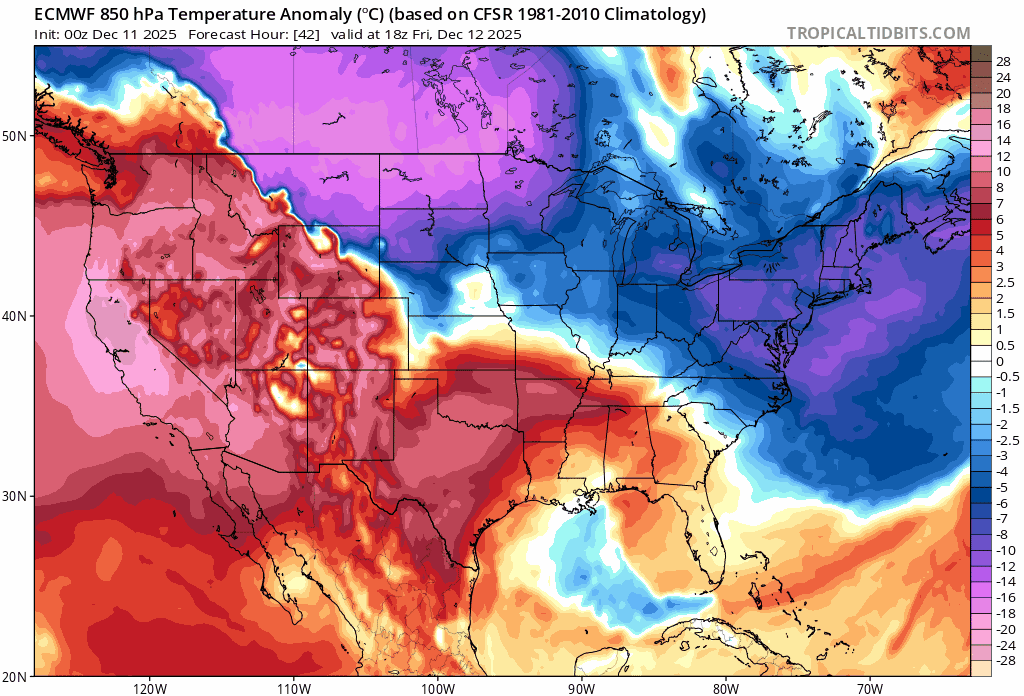 Arctic air is pouring into the northeastern states today in the wake of yesterday’s “clipper” system and the next Arctic blast arrives in the north-central states by tomorrow night/early Saturday. This next blast will mean business with some serious cold and numerous record or near record low temperatures are possible this weekend. Maps courtesy ECMWF, tropicaltidbits.com