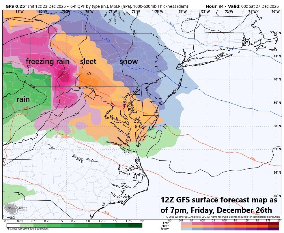 Lots of colors on a surface forecast map this time of year is not good as it suggest ice is in the mix…indeed, there is a significant winter storm threat for the Mid-Atlantic and NE US later Friday and Friday night with substantial snow (blue) likely in some areas and serious icing in others (sleet shown in orange, freezing rain shown in pink). Map courtesy ECMWF, Weather Bell Analytics