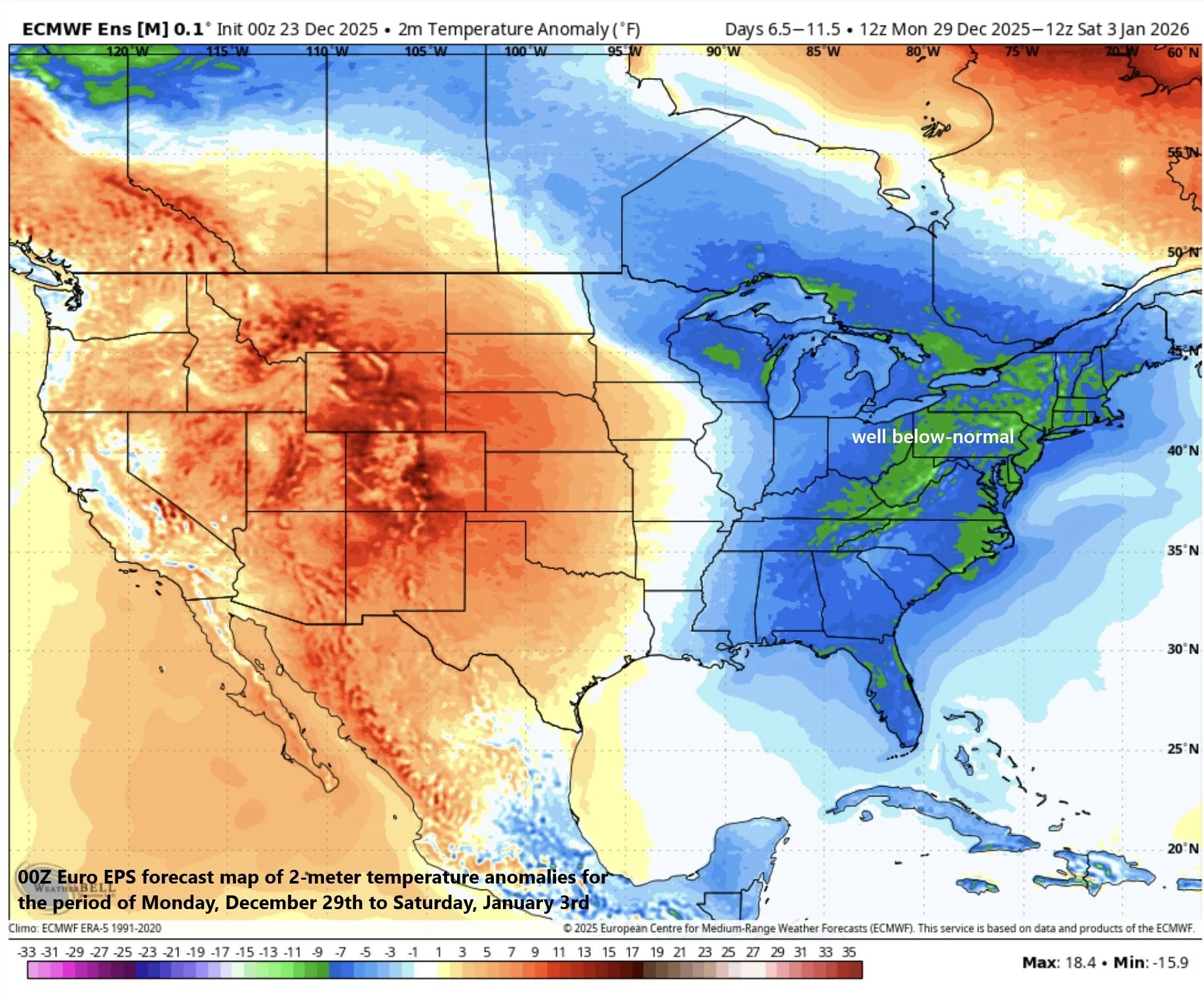 The period from Monday, December 29th to Saturday, January 3rd is likely to average out well below-normal for temperatures across the eastern US. Map courtesy ECMWF, Weather Bell Analytics