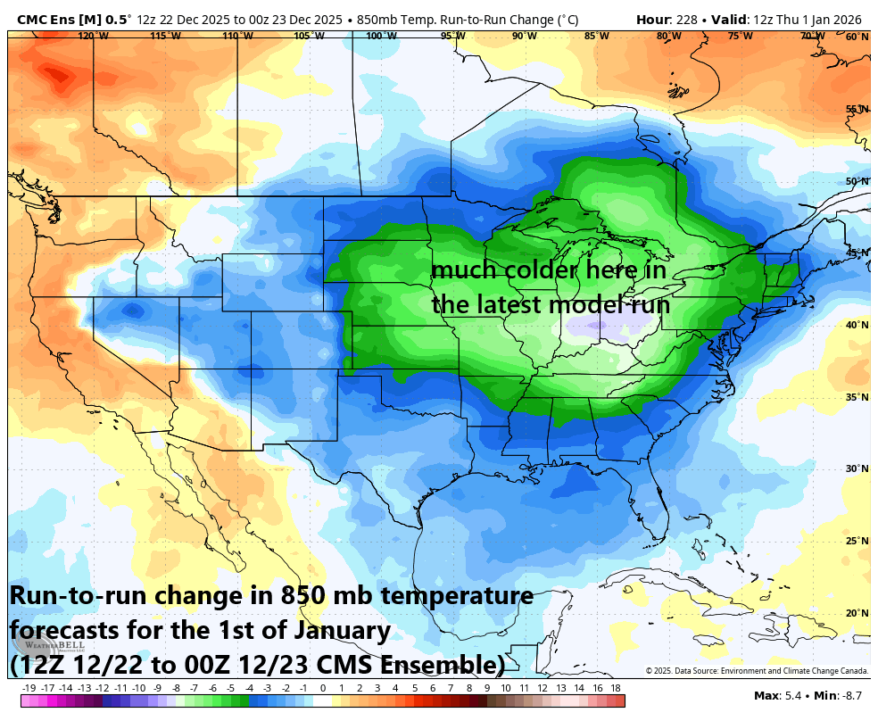 Computer forecast models continue to underestimate cold air outbreaks coming into the US when more than a few days in advance. This map is an example of a drastic “model-to-model” change in the forecasted 850 mb temperatures for the 1st day of January (i.e., next Thursday) with much colder conditions on the most recent run throughout much of the country compared to the prior run. Map courtesy Canadian Met Centre, Weather Bell Analytics