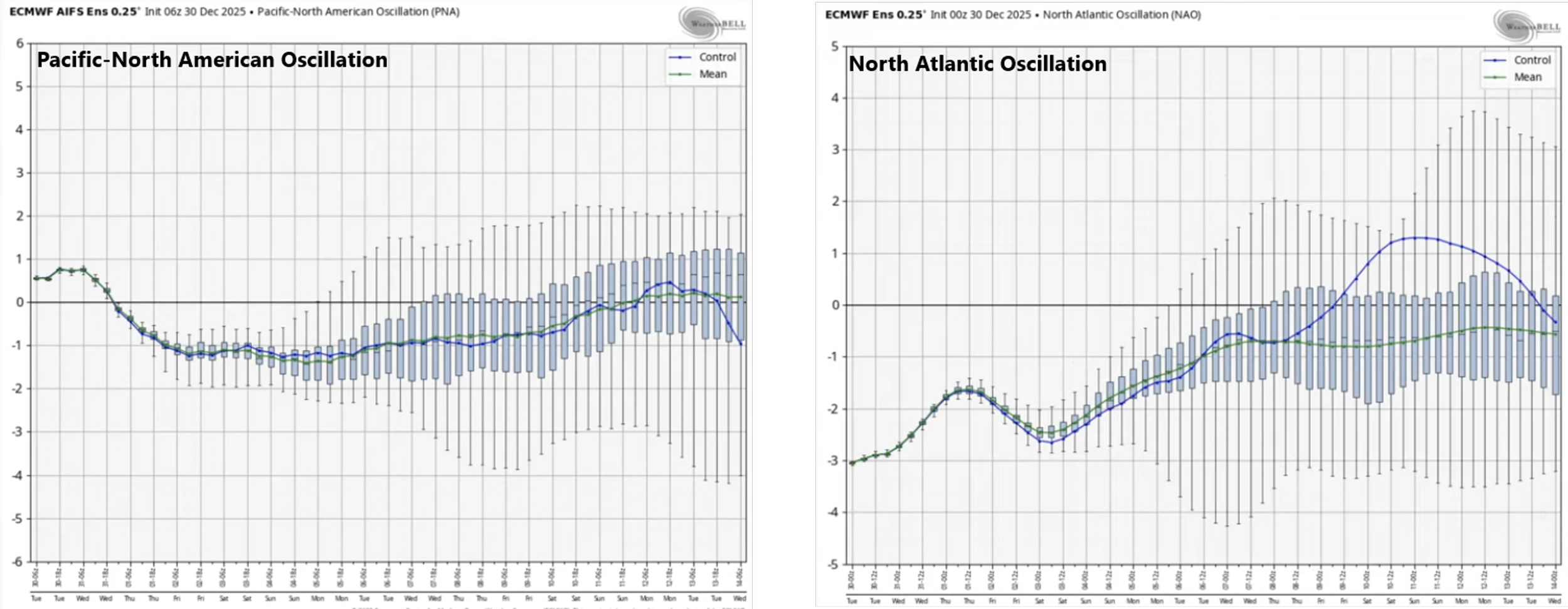 Teleconnection indices such as the Pacific-North American (left plot) and North Atlantic Oscillation (right plot) generally support the idea of the development of an Alaska ridge of high pressure (+PNA) and high-latitude blocking (-NAO, green line). Plots courtesy NOAA, Weather Bell Analytics, BAM Weather