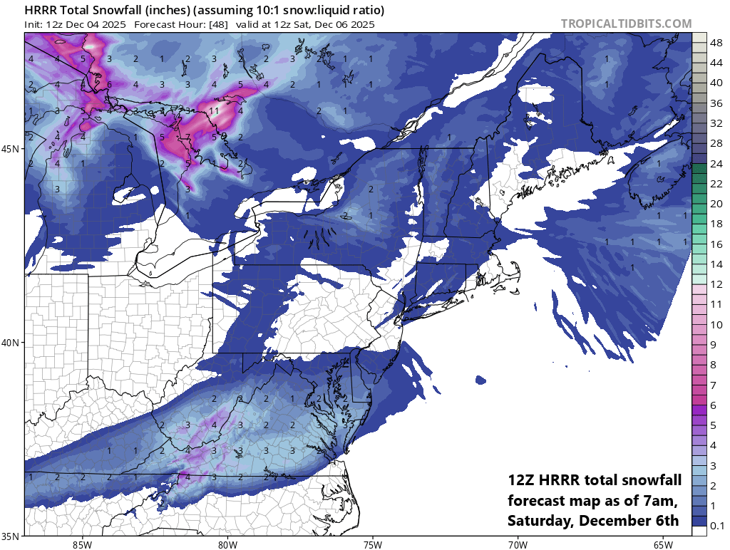 Accumulating snow is quite likely on Friday across much of the southern Mid-Atlantic region from DC/Virginia to the Delmarva Peninsula to southern New Jersey. As much as 2 or 3 inches in some parts of the DC metro and 4 or 5 inches can fall in portions of central and southern Virginia. The Philly and NYC metro regions will be on the northern fringes of this system. Map courtesy NOAA, tropicaltidbits.com