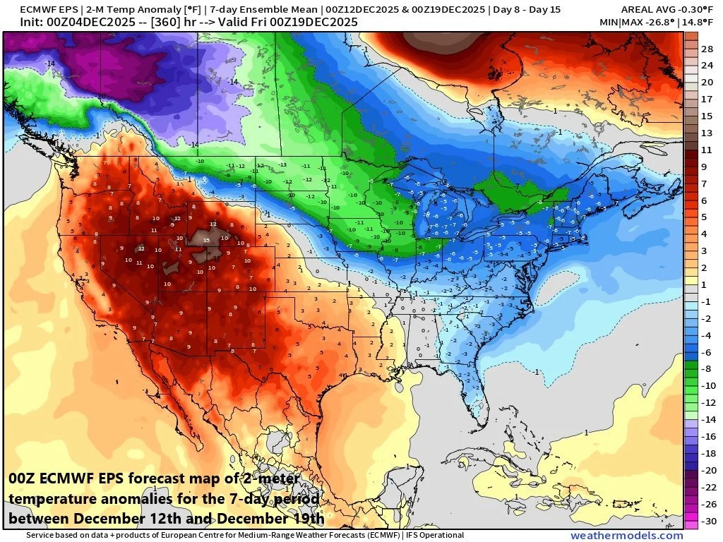 The overall cold weather pattern will continue into at least the middle of the month of December across the Northern Plains, Great Lakes, Mid-Atlantic and Northeast US with numerous additional cold air outbreaks on the table. Map courtesy ECMWF, weathermodels.com