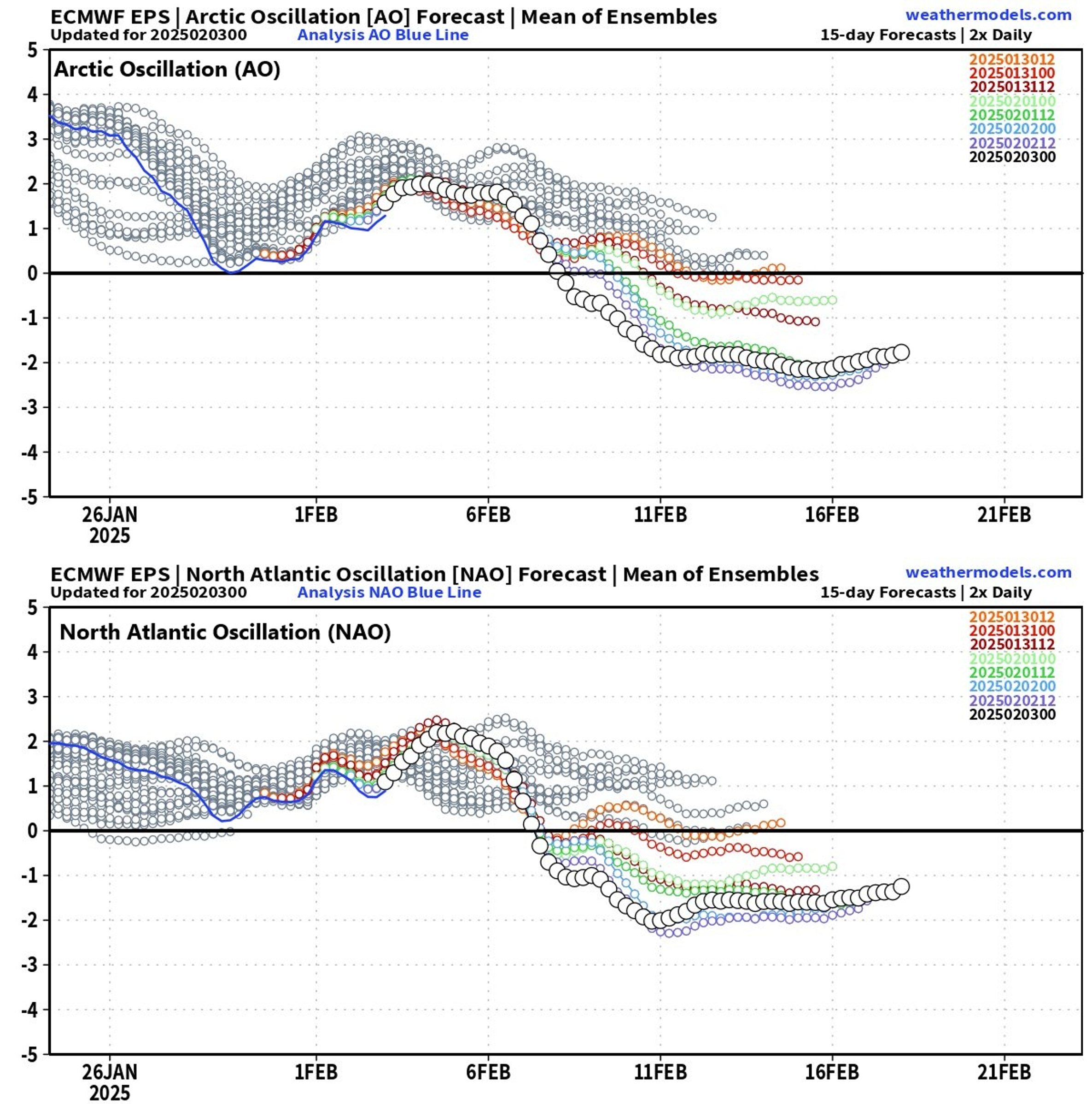 The teleconnection indices known as the AO (top) and NAO (bottom) are forecasted by the 00Z EPS to slip into “negative” territory for a sustained period of time beginning early next week and this is usually correlated with the development of “high-latitude blocking”, which, in turn, favors the transport of cold air masses from northern Canada into the central and eastern US. Plots courtesy ECMWF, weathermodels.com