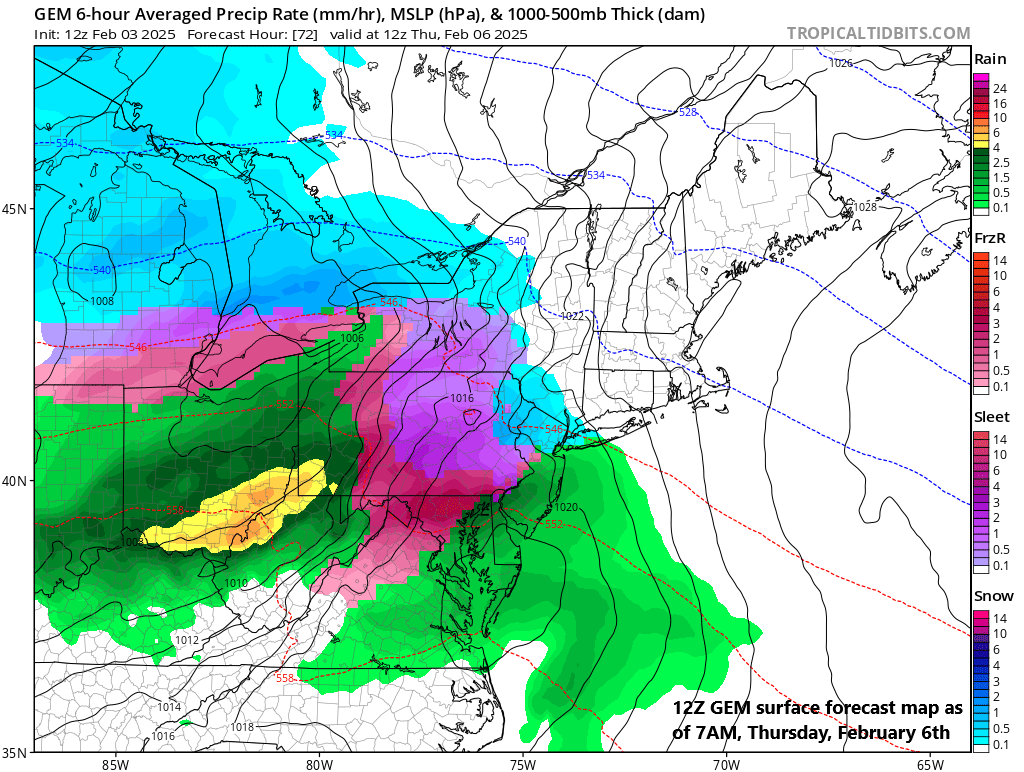 If there are lots of colors on the surface forecast map this time of year, it is usually not a good thing. Snow may take place at the front-end of the coming mid-week event (shown for this time in blue), but sleet (purple) and freezing rain (pink) is likely the bigger concern for the Mid-Atlantic region…icing threat likely in the late Wednesday to early Thursday time period. Map courtesy Canadian Met Centre, tropicaltidbits.com