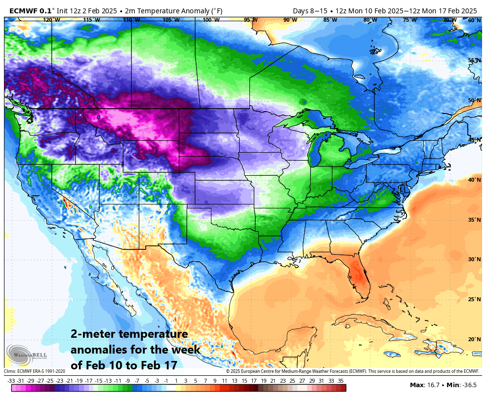 Numerous signs point to a colder-than-normal weather pattern by the middle of the month across much of the nation as depicted in this forecast map of 2-meter temperature anomalies that are averaged over the 7-day period from February 10th to February 17th. Map courtesy ECMWF, Weather Bell Analytics