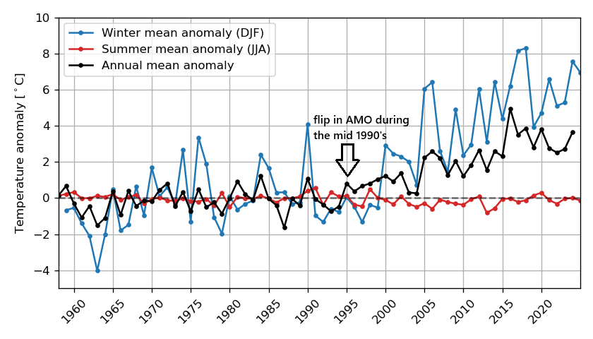 Anomaly of the +80N mean temperature index is shown here back to 1960, compared with climate (annual mean minus the corresponding climate value). “All year” anomaly is illustrated with the black line and has climbed since the middle 1990s. The “summertime” anomaly of June, July, and August is illustrated with red and has held at nearly normal levels since 1960 while winter mean anomalies (blue line) has shown an increase since the middle 1990’s. An important shift in the Atlantic Multidecadal Oscillation (AMO) took place during the middle 1990’s (indicated by arrow) when it flipped from a “negative-to-positive” phase. Reference climate is ECMWF-ERA40 1958-2002. Plot courtesy Danish Meteorological Institute