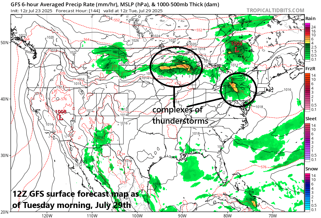 The upper-level pattern next week will feature strong high pressure ridging over the south-central states and a northwest flow of air from the Great Lakes to the Northeast US. This kind of pattern sometimes produces complexes of thunderstorms that travel in the northwest flow from the Great Lakes/Midwest to the Mid-Atlantic/Northeast US...something to monitor during the next several days. Looking ahead, there are signs that a strong upper-level trough may become positioned over southeastern Canada at the end of next week potentially bringing a pleasant start to the month of August.
