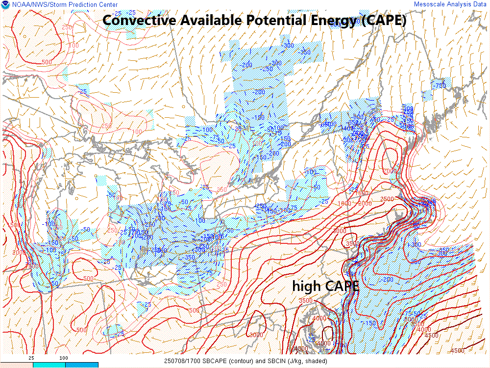 Thunderstorms are intensifying at this hour and widening in coverage across the central Mid-Atlantic region and these cells are heading east towards the I-95 corridor with a likely arrival timetable of 3-9pm. The atmosphere is quickly destabilizing as strong surface heating is combining with a very moist boundary layer that features dewpoints way up middle 70’s. One metric used to assess stability in the lower atmosphere is called “Convective Available Potential Energy (CAPE)” and it has increased dramatically during the past few hours with the strengthening of upward motion.