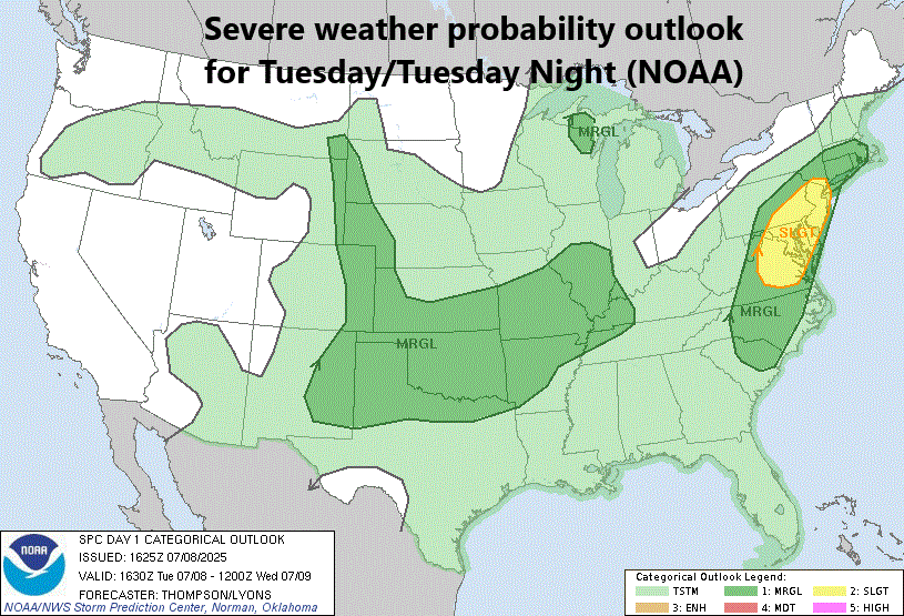 Severe weather probability outlook for later today and tonight as predicted by NOAA’s Storm Prediction Center.