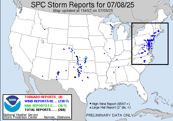 Powerful storms that pushed through the region late yesterday were accompanied by numerous damaging wind reports (markers in blue). While there were “tornado warnings” as this line of storms came through the area, so far there have been no confirmed tornado reports. Map courtesy NOAA/SPC
