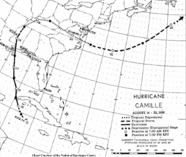A chart by NOAA from 1969 with the path of Hurricane Camille; Credit NOAA