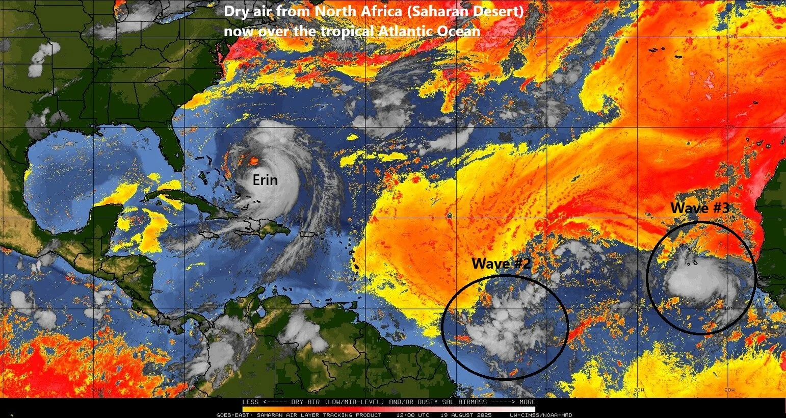 Hurricane Erin has weakened in recent hours, but is has also expanded in size which increases the chance for serious impact in the Outer Banks region of North Carolina. There are two other tropical systems now in the eastern Atlantic and both are currently in the vicinity of some dry air (shown in orange), but both have a chance of reaching named tropical storm status in coming days. Map courtesy NOAA, University of Wisconsin/CIMSS