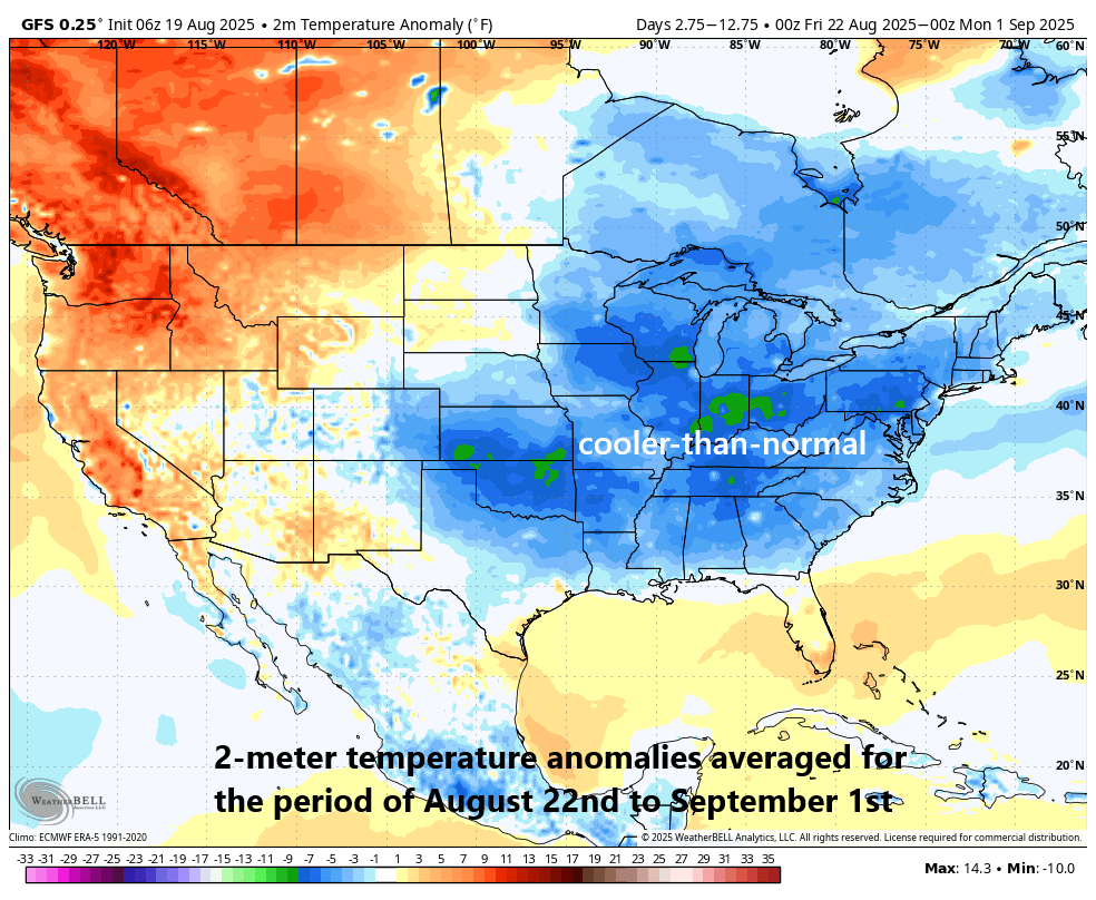 Once Hurricane Erin exits off to the northeast and out over the open waters of the North Atlantic, a cooler-than-normal weather pattern is likely to set up for much of the eastern half of the nation for the last week or so of the month of August. Map courtesy NOAA, Weather Bell Analytics (courtesy Meteorologist Joe Bastardi, X)