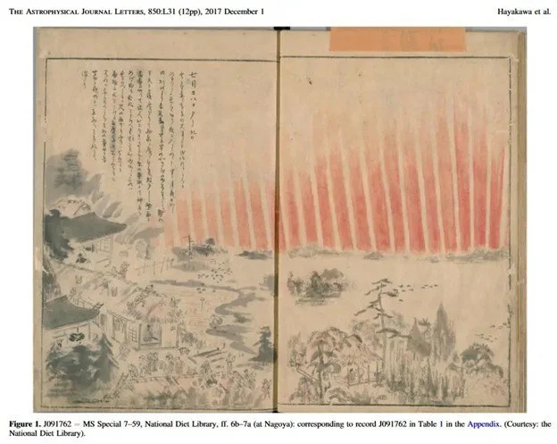 An eyewitness sketch of red auroras over Japan in mid-September 1770. [Ref]
