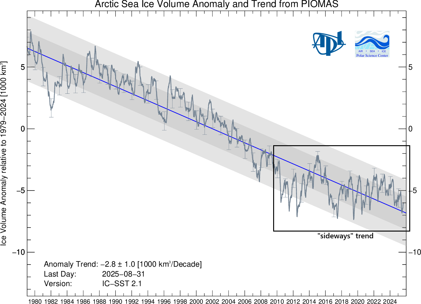 Arctic sea ice volume as estimated by the University of Washington’s PIOMAS numerical model shows resilience during the last dozen years or so with a “sideways” trend (boxed in region). This model output data is updated on a monthly basis and is shown here through August 2025. Details on the PIOMAS model are available here.