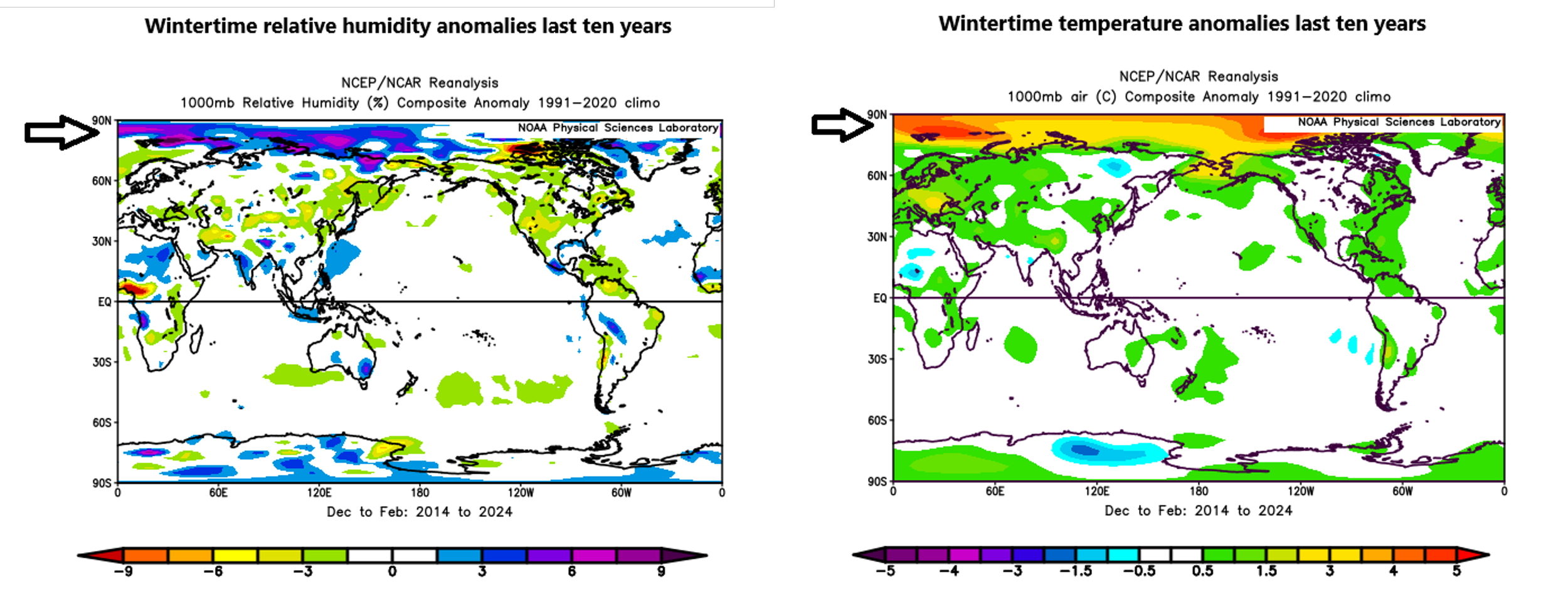 Relative humidity (left) and surface temperatures (right) have averaged higher-than-normal during the wintertime in the Arctic region (indicated by arrows) for the last ten years (2014-2024). An increase in water vapor (and relative humidity) in the cold, dry cold season of the Arctic can have much more impact on air temperatures as compared to during the warmer, more humid summer (melting) season. Maps courtesy NOAA/NCAR