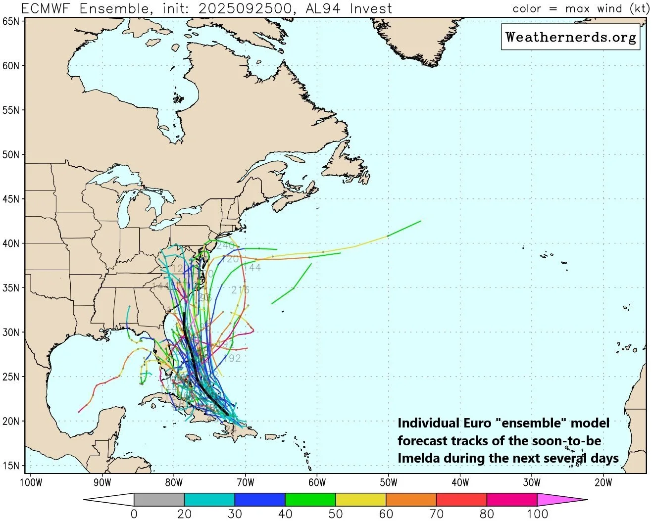 The 00Z Euro Ensemble forecast tracks of the individual members push soon-to-be Imelda to the Bahamas and then potentially into the Carolinas. Map courtesy ECMWF, weathernerds.org