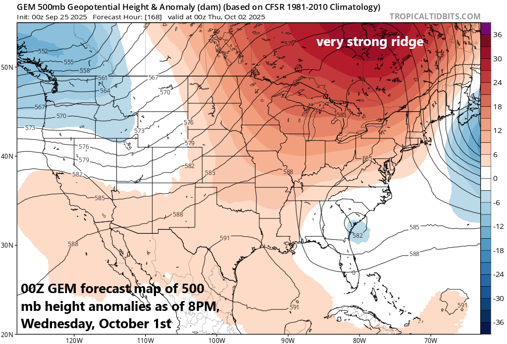 Another key player in the ultimate path of Humberto and Imelda will be an upper-level ridge of high pressure that builds into southeastern Canada by the middle of next week. Map courtesy Canadian Met Centre, tropicaltidbits.com
