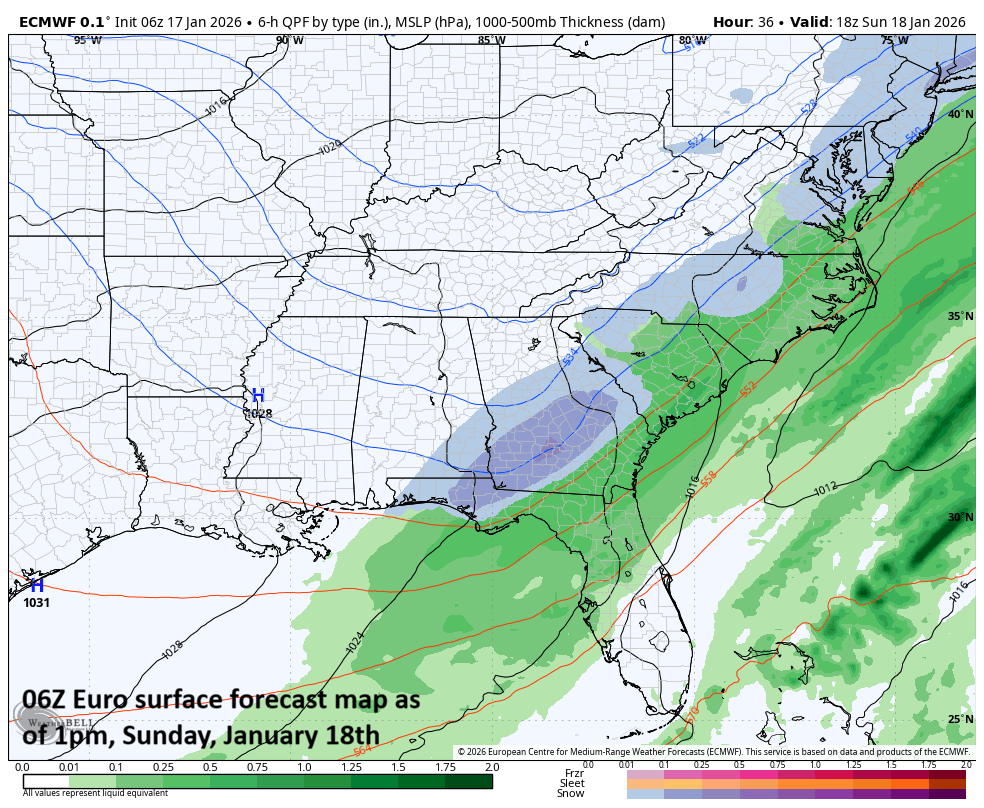 A coastal storm on Sunday can bring snow all the way down to the southeastern states…even some accumulations are possible in that part of the country. Map courtesy ECMWF, Weather Bell