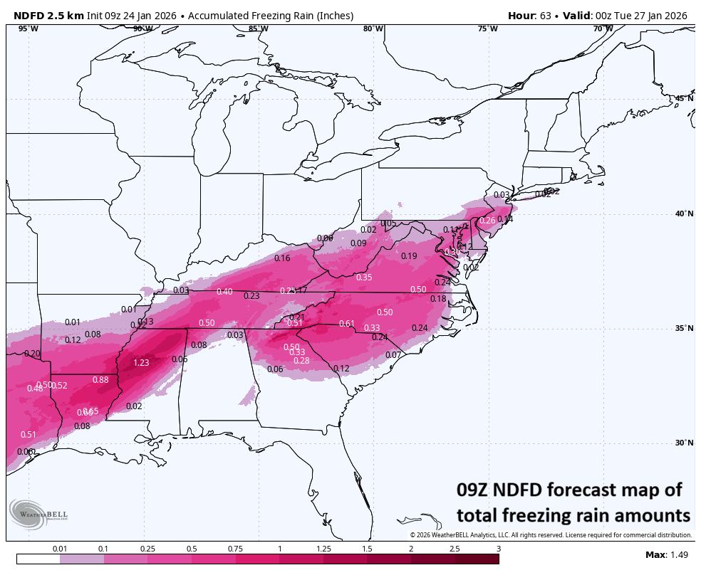 A thin layer of slightly above freezing air is likely to cause the snow to mix with or changeover to sleet and/or freezing rain for awhile in the much of the DC-to-Philly-to-NYC corridor. The freezing rain can turn out to be rather significant in some spots as this forecast map suggests. Map courtesy NOAA, Weather Bell