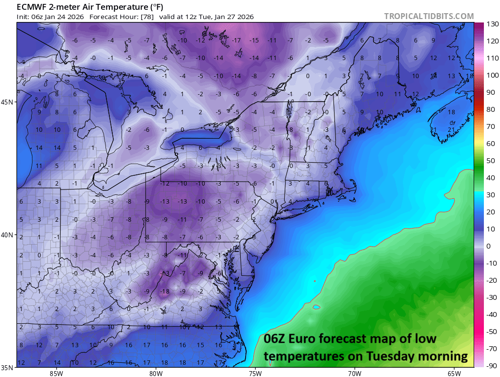 Temperatures could flirt with the zero-degree mark next week for overnight lows…even in the big cities along I-95. Map courtesy ECMWF, tropicaltidbits.com