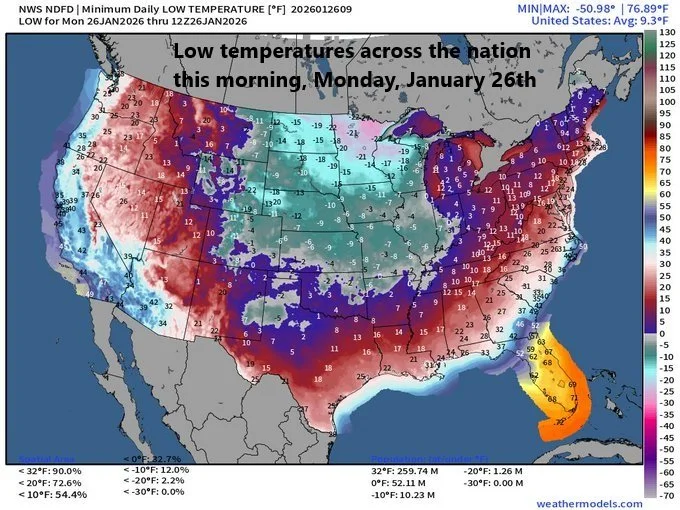 Talk about some extreme cold…the average minimum temperature on Monday morning, January 26th, across the nation was 9.3 degrees (F). This average low temperature comes in the lowest 5th percentile for the month of January since records began in the early 1950’s. Map courtesy NOAA, Dr. Ryan Maue (X)