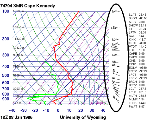 The wind barbs (circled region on right) on this sounding plot at Cape Kennedy on the morning of the launch featured a noticeable change of wind speed and wind direction with height. This “wind shear” was likely an important contributing factor to the Space Shuttle Challenger disaster. Map courtesy University of Wyoming.