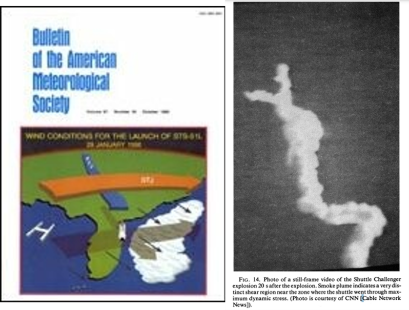 In addition to the extreme cold, wind shear (change of wind direction and speed with altitude) played a vital role in the Challenger disaster as it contributed to the failing of the O-rings on the Solid Rocket Booster. At the time of the launch, the upper-tropospheric-lower-stratospheric wind regime was marked by the juxtaposition of two different airstreams. A west-to-northwest flow of air near 300 millibars exiting the polar-front jet (PFJ) located over the Ohio and Tennessee valleys was located beneath an accelerating west-to-southwest flow of air entering a sub-tropical jet (STJ) located east of Florida. The interaction of these two different jet regimes appeared to be most pronounced over north-central Florida by 1630 GMT with descent maximized just to the west of Florida and ascent located just above and east of the launch site location. (Source: Bulletin of the American Meteorological Society, Volume 67, Number 10, October 1986, “A Report on the Upper-Level Wind Conditions Preceding and During the Shuttle Challenger (STS 51-L) Explosion”; Dr. Louis W. Uccellini, et al.)