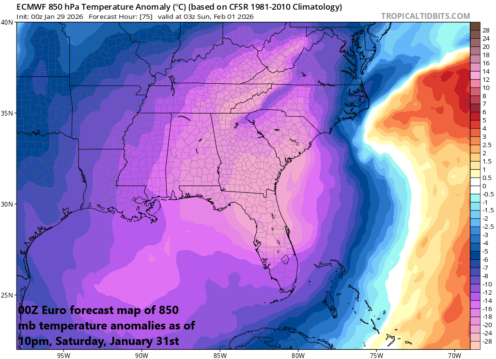 It was very cold this morning across Florida, but the coldest air mass is yet to come. Temperatures by Sunday morning should reach near freezing as far south as Miami…not far from their all-time lowest recorded temperature. Map courtesy ECMWF, tropicaltidbits.com