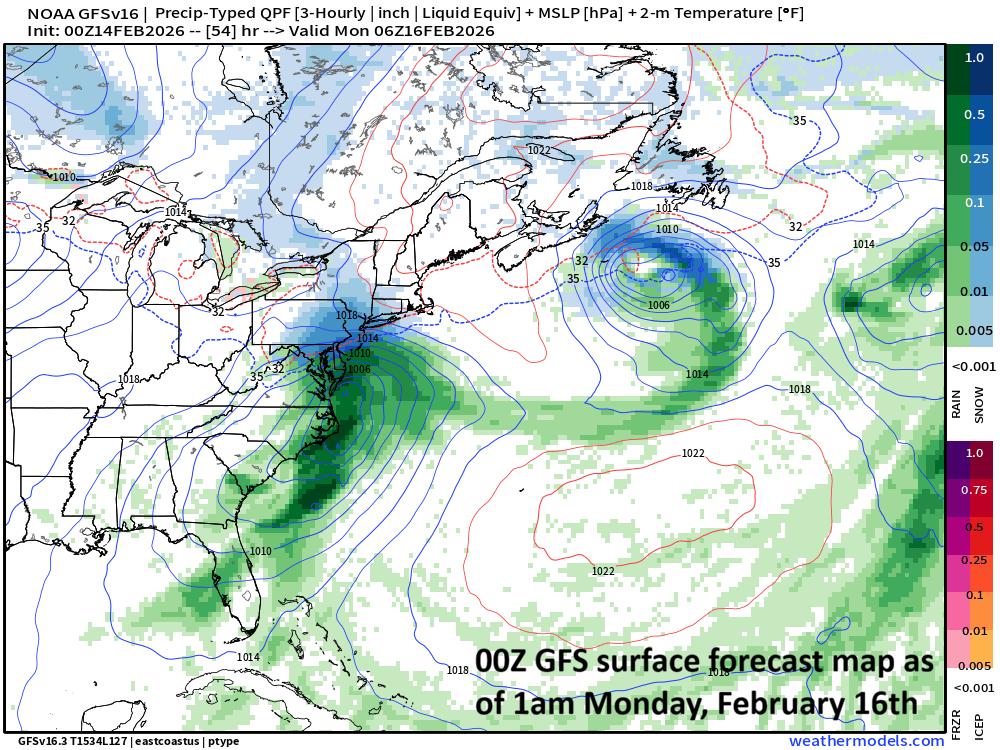 Low pressure will likely be situated just off the Mid-Atlantic coastline by early Monday with precipitation winding down across the Mid-Atlantic region. Map courtesy NOAA, weathermodels.com (Dr. Ryan Maue, X)