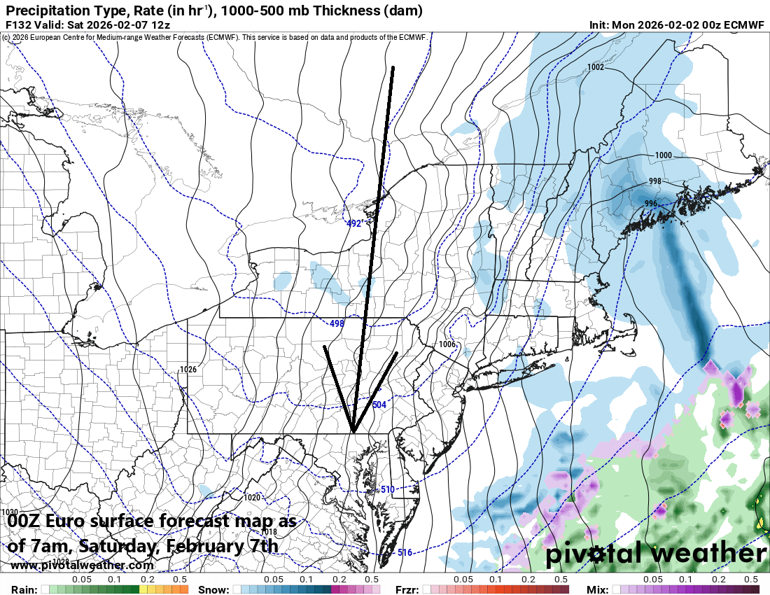 While well above-normal, ice cover on the Great Lakes is only partial as we enter February. In the conventional Arctic air outbreak for the northeastern US, the flow of air is from a northwesterly direction and this unfrozen lake water would have a modifying effect. In the weekend scenario, the low-level flow of air will likely be from a northerly direction and this will inhibit the modifying effects of the Great Lakes. Map courtesy NOAA