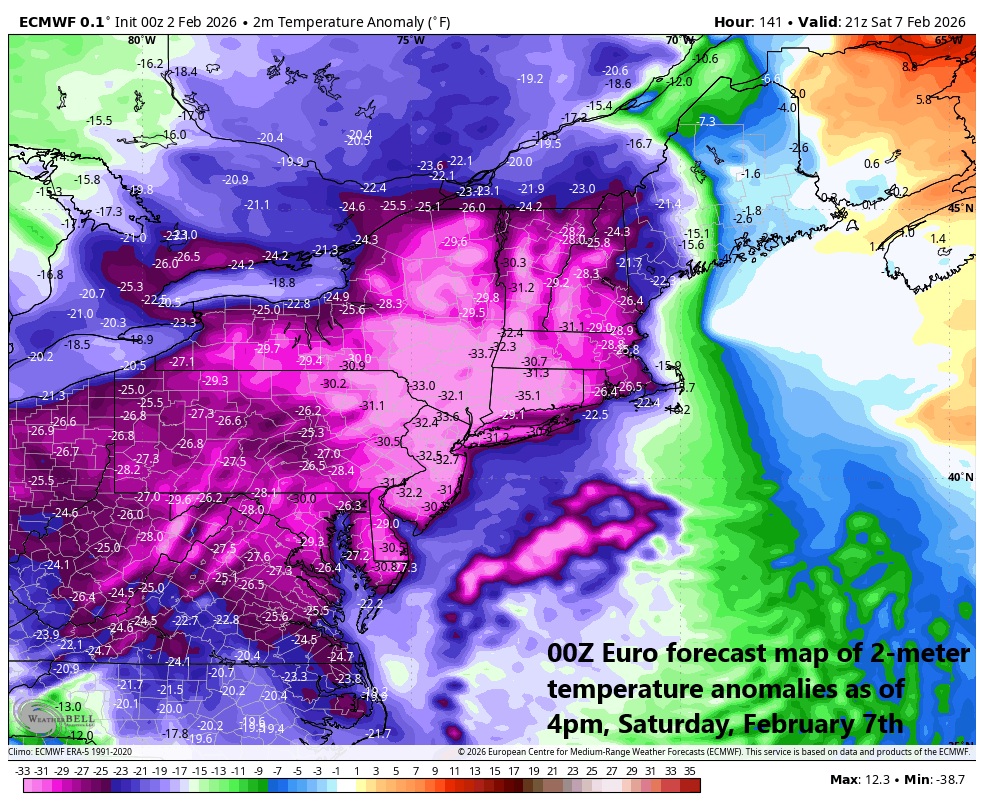 With the direct discharge of Arctic air this weekend from eastern Canada into the northeastern US, overnight lows are again likely to fall into single digits in much of the I-95 corridor and daytime highs might do no better than the teens. Map courtesy ECMWF, Pivotal Weather