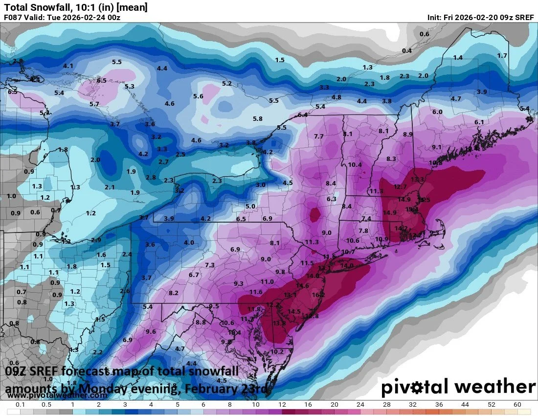 Snowfall can be significant in the DC-to-Philly-to-NYC corridor from later Sunday into early Monday with 6-12 inches on the table and potentially even higher snowfall amounts. Map courtesy NOAA, Pivotal Weather