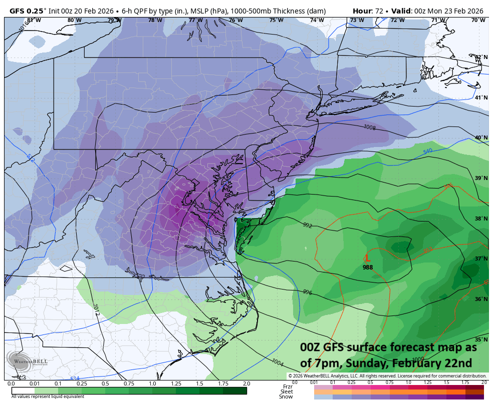 Low pressure will intensify over the western Atlantic Ocean by the end of the weekend and it can result in a significant snow event for the DC-to-Philly-to-NYC corridor if it hugs the coastline rather than moving farther out-to-sea. Map courtesy NOAA, Weather Bell