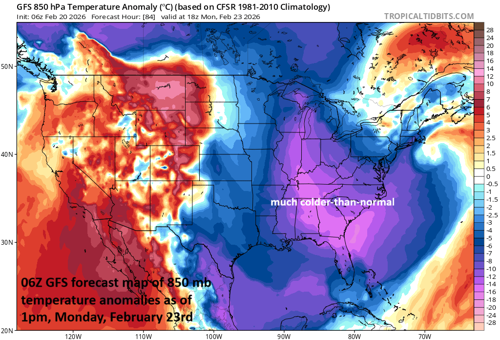 No matter what happens with the late weekend storm system, a much colder-than-normal air mass will follow into the eastern states for the early part of next week with an impact all the way down to the state of Florida. Map courtesy NOAA, tropicaltidbits.com
