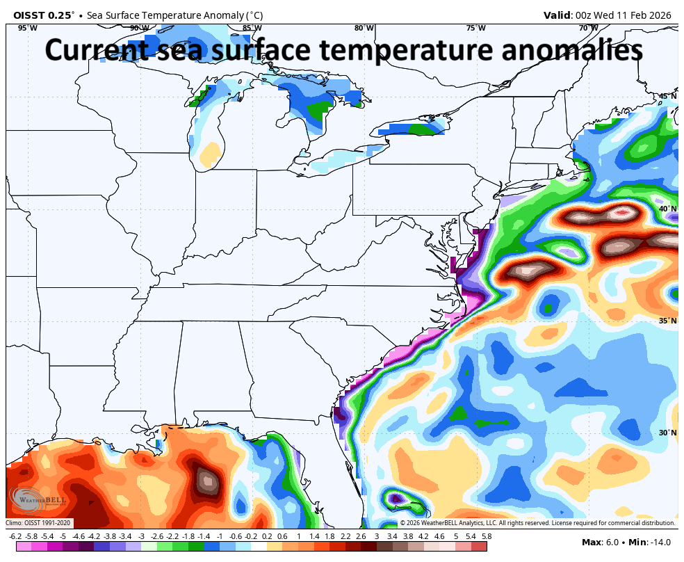 There are two noticeable blobs of warmer-than-normal water off the east coast and this late weekend storm system could very well trek from one to the other. Map courtesy NOAA, Weather Bell