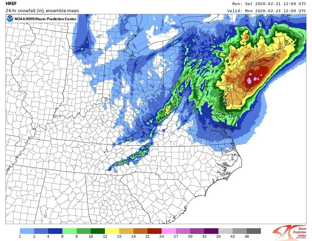 This map shows the mean snowfall amounts from an “ensemble” run of a high-resolution forecast model with high levels of as much as 2 feet depicted across the eastern Mid-Atlantic region. Map courtesy NOAA