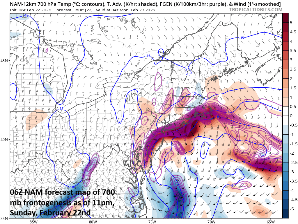 There will be an area with tremendous upward motion (shown purple) during the nighttime hours in a region with strong 700 mb “frontogenesis”. In this area of the eastern Mid-Atlantic, snow can fall at 2+ inches per hour and “thundersnow” is a possibility during the nighttime and on Monday morning. Map courtesy NOAA, tropicatidbits.com