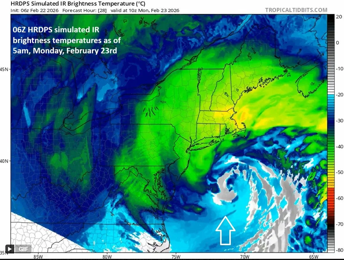 The low pressure system during this upcoming event will become powerful and an “eye-like” feature (above the arrow) may form at its center similar in appearance to hurricanes and not uncommon for some of the great nor’easters. Map courtesy NOAA, tropicaltidbits.com