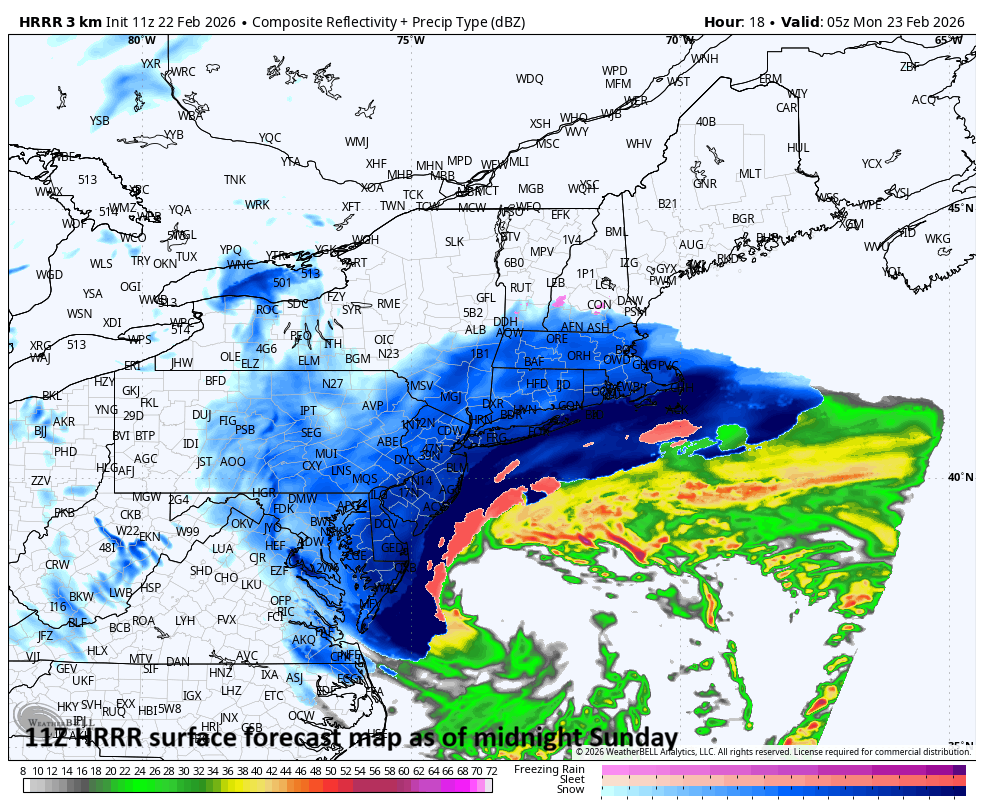 Surface forecast map for midnight Sunday by the 11Z HRRR with snow (blue) throughout the eastern Mid-Atlantic. Map courtesy NOAA, Weather Bell