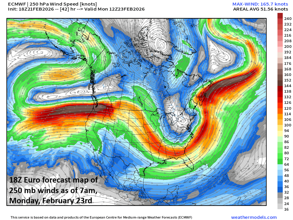 A strong jet streak in the upper part of the atmosphere will support rapid intensification of low pressure later today and tonight just off the Mid-Atlantic coastline. Map courtesy NOAA, weathermodels.com