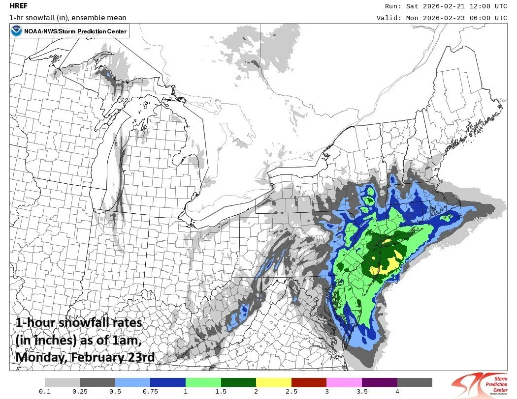 The snow will fall very heavily tonight and can exceed 2 inches per hour in some parts of the eastern Mid-Atlantic region with “thundersnow” on the table. Map courtesy NOAA