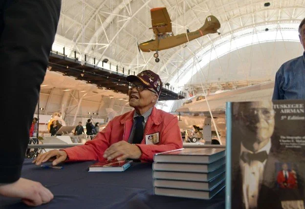 Gen. Charles McGee, 100, a veteran and Tuskegee Airman, attends African American Pioneers in Aviation and Space Family Day on February 8, 2020 at the Smithsonian Air and Space Museum in Chantilly, Va. (Credit: Marvin Joseph/The Washington Post)