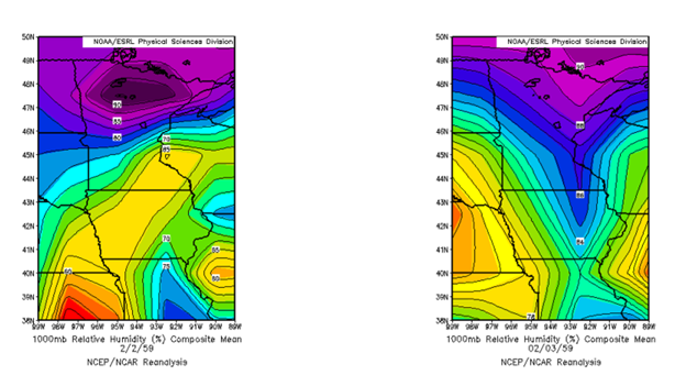 Low-level relative humidity climbed noticeably across Iowa between February 2nd (left) and the 3rd (right) as southerly winds ahead of an advancing cold front intensified and pumped moisture northward from the southern US into the Upper Midwest. Map courtesy NOAA/NCAR reanalysis